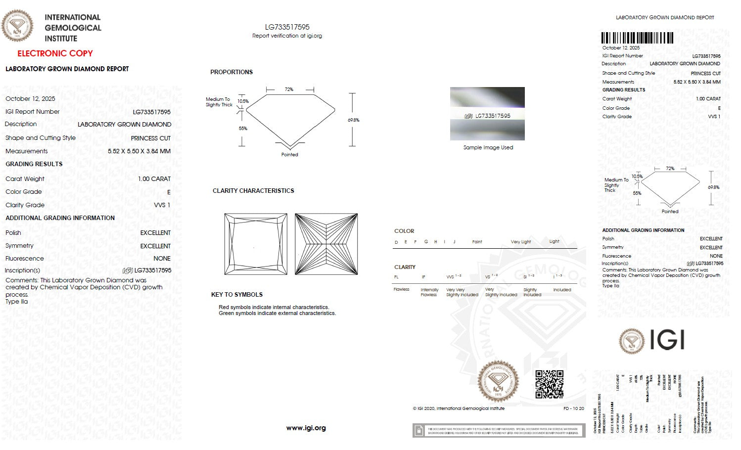 Exceptional 1.00 carat Princess cut lab-grown diamond with outstanding brilliance and fire. This ethically sourced, IGI certified CVD diamond combines modern technology with timeless elegance.