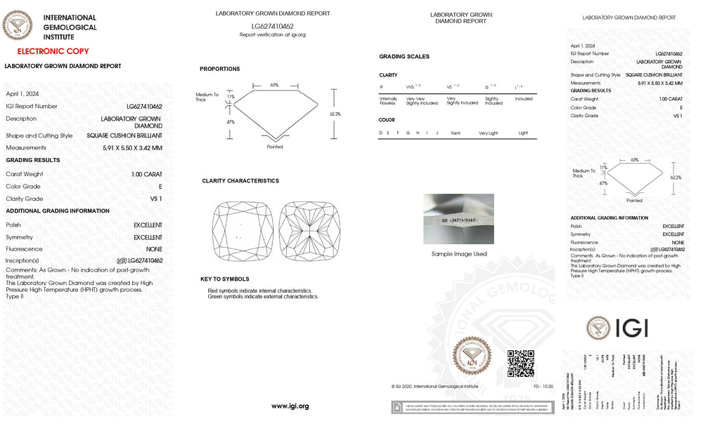 Unveil the brilliance of our 1.00 carat Cushion Cut Lab-Grown Diamond, meticulously crafted to perfection: