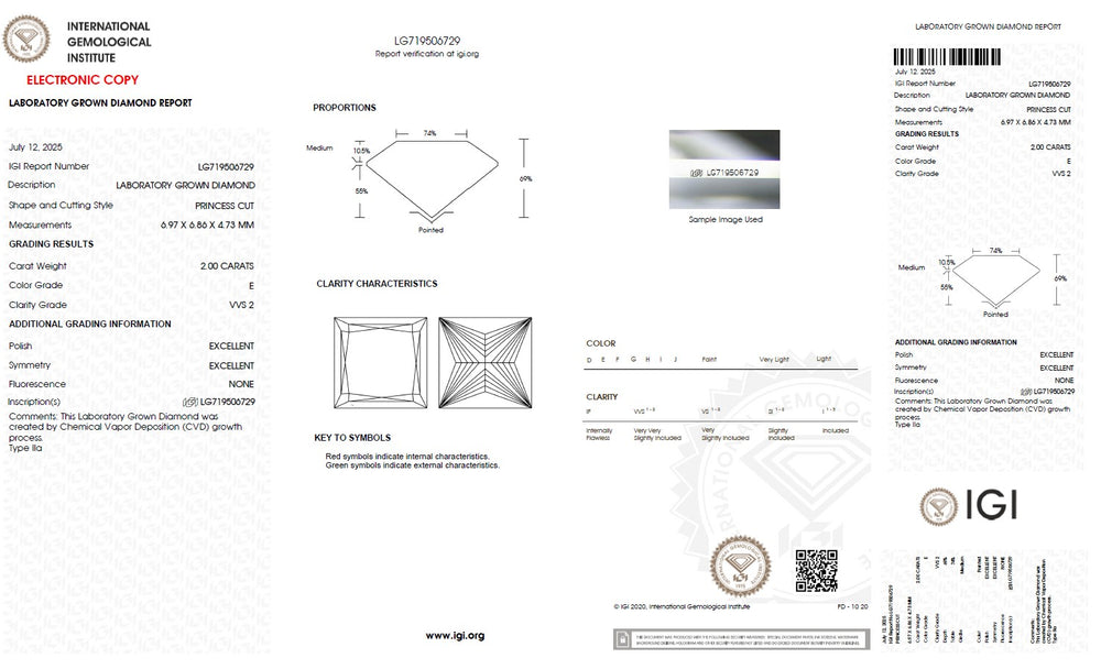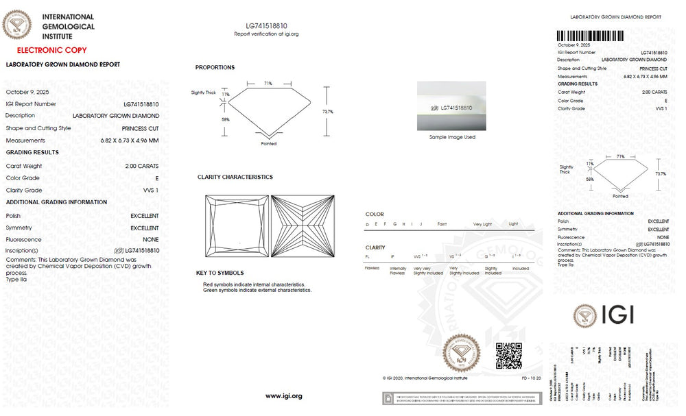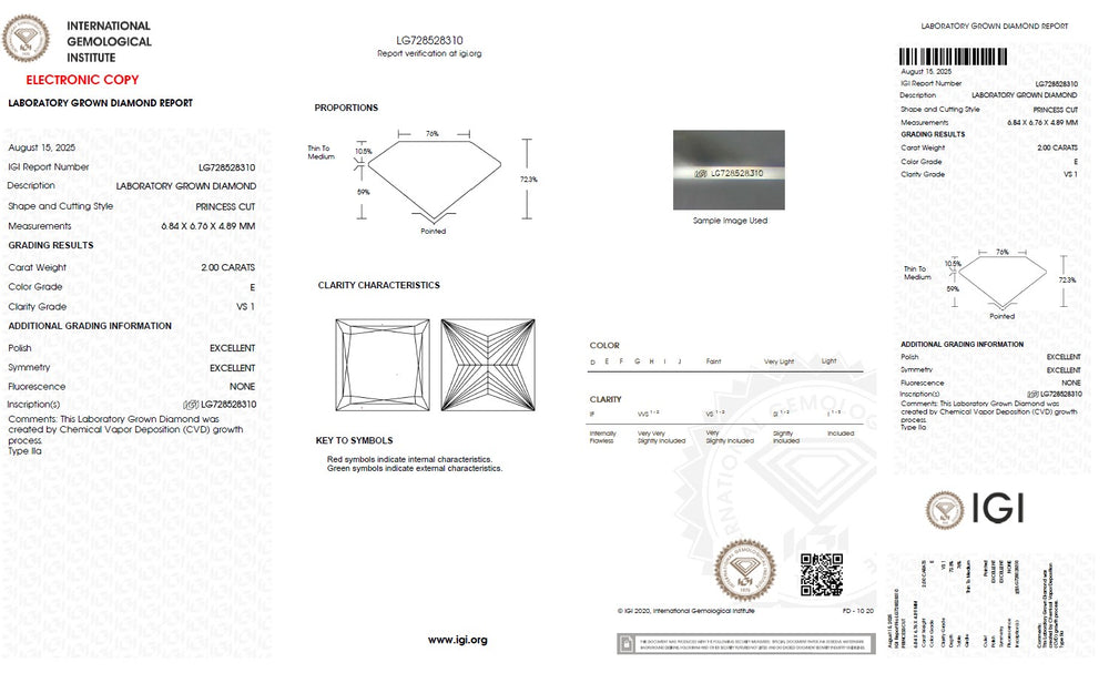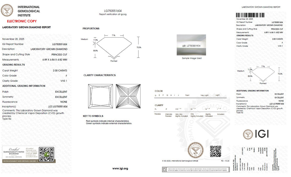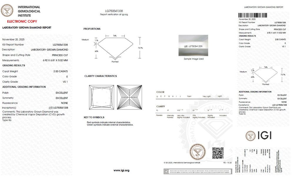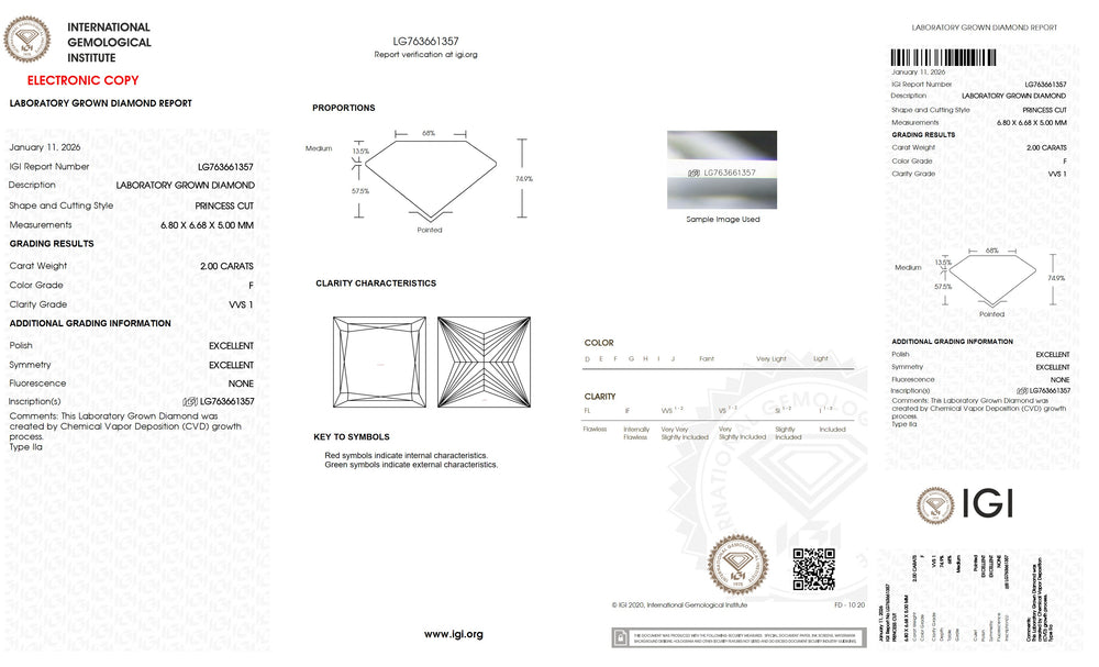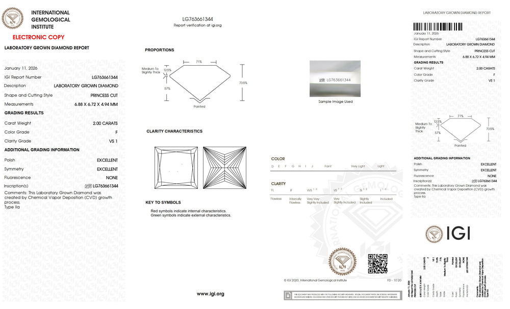 Every princess cut lab grown diamond is carefully selected based on the 4Cs — cut, colour, clarity and carat — ensuring superior brilliance and consistent quality. Precision cutting enhances light reflection and sparkle, while carefully graded colour and clarity maintain visual purity and beauty. IGI certification verifies each diamond’s characteristics, including cut, colour, clarity, carat weight and measurements, providing complete transparency and confidence in diamond selection. With strict quality standards and reliable grading, each diamond is chosen to deliver lasting brilliance and value.