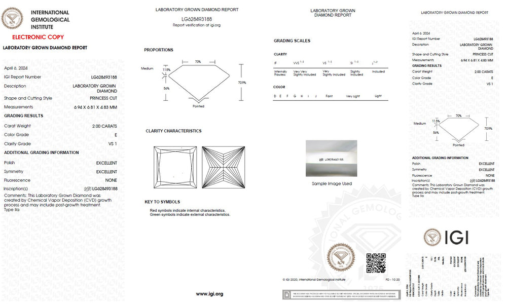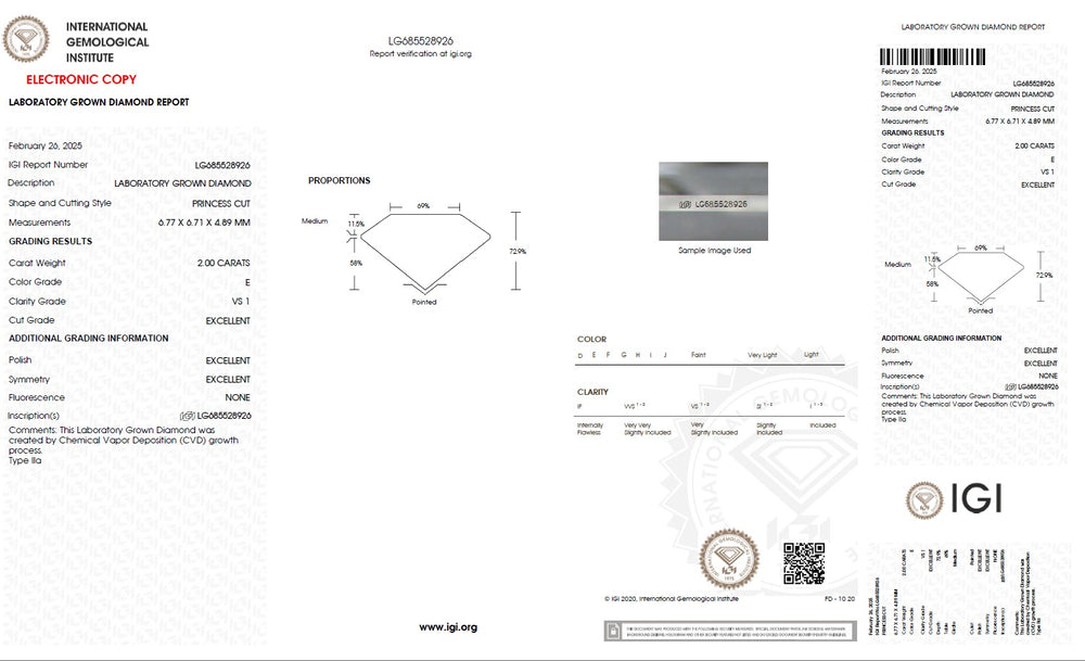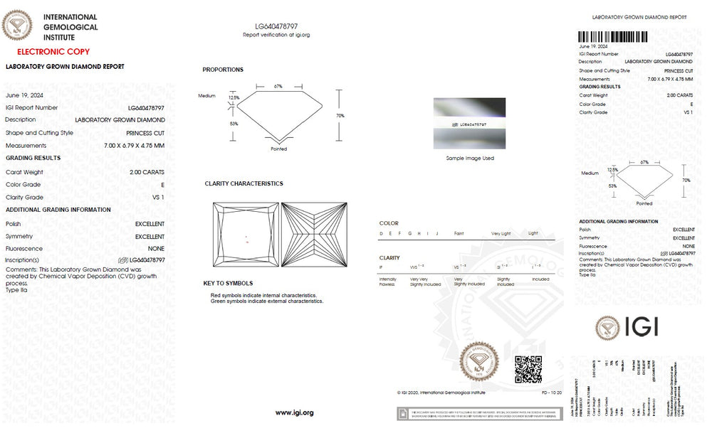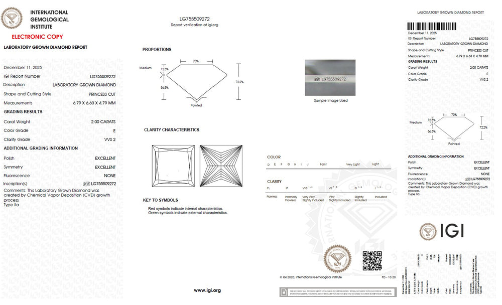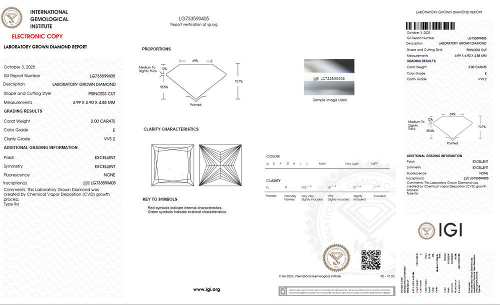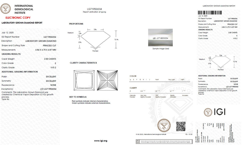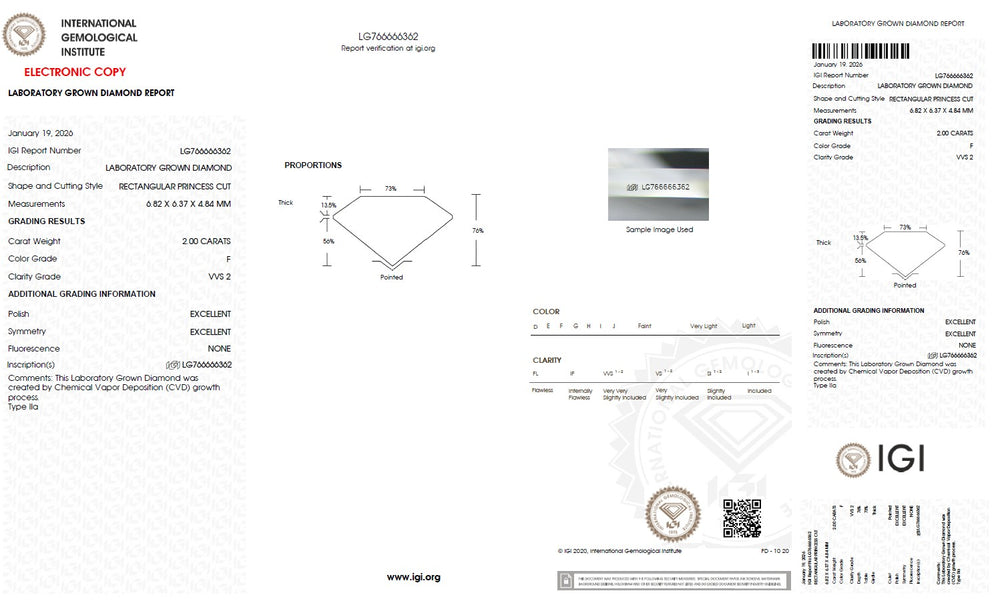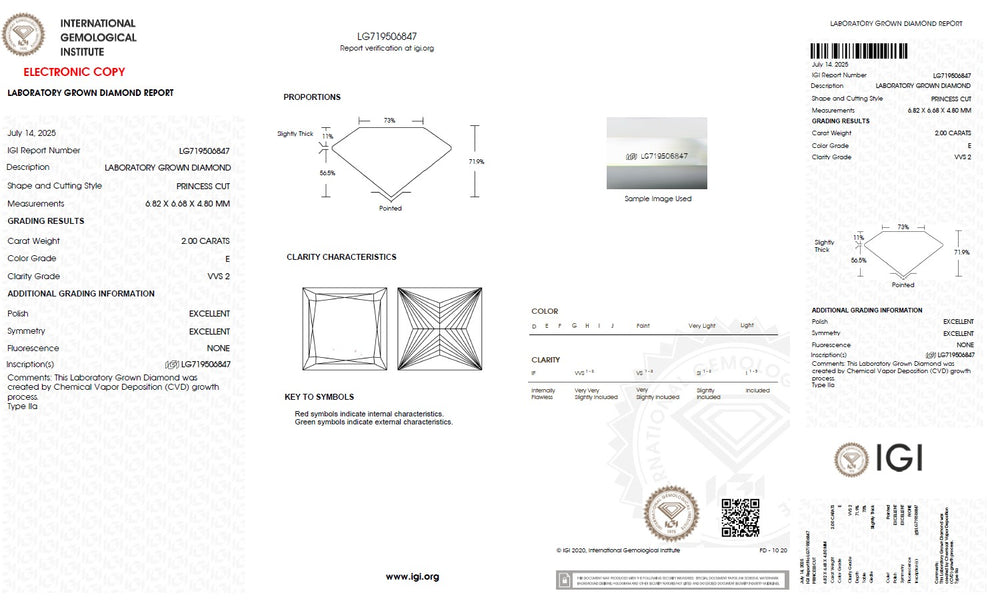 Every princess cut lab grown diamond is carefully selected based on the 4Cs — cut, colour, clarity and carat — ensuring superior brilliance and consistent quality. Precision cutting enhances light reflection and sparkle, while carefully graded colour and clarity maintain visual purity and beauty. IGI certification verifies each diamond’s characteristics, including cut, colour, clarity, carat weight and measurements, providing complete transparency and confidence in diamond selection. With strict quality standards and reliable grading, each diamond is chosen to deliver lasting brilliance and value.