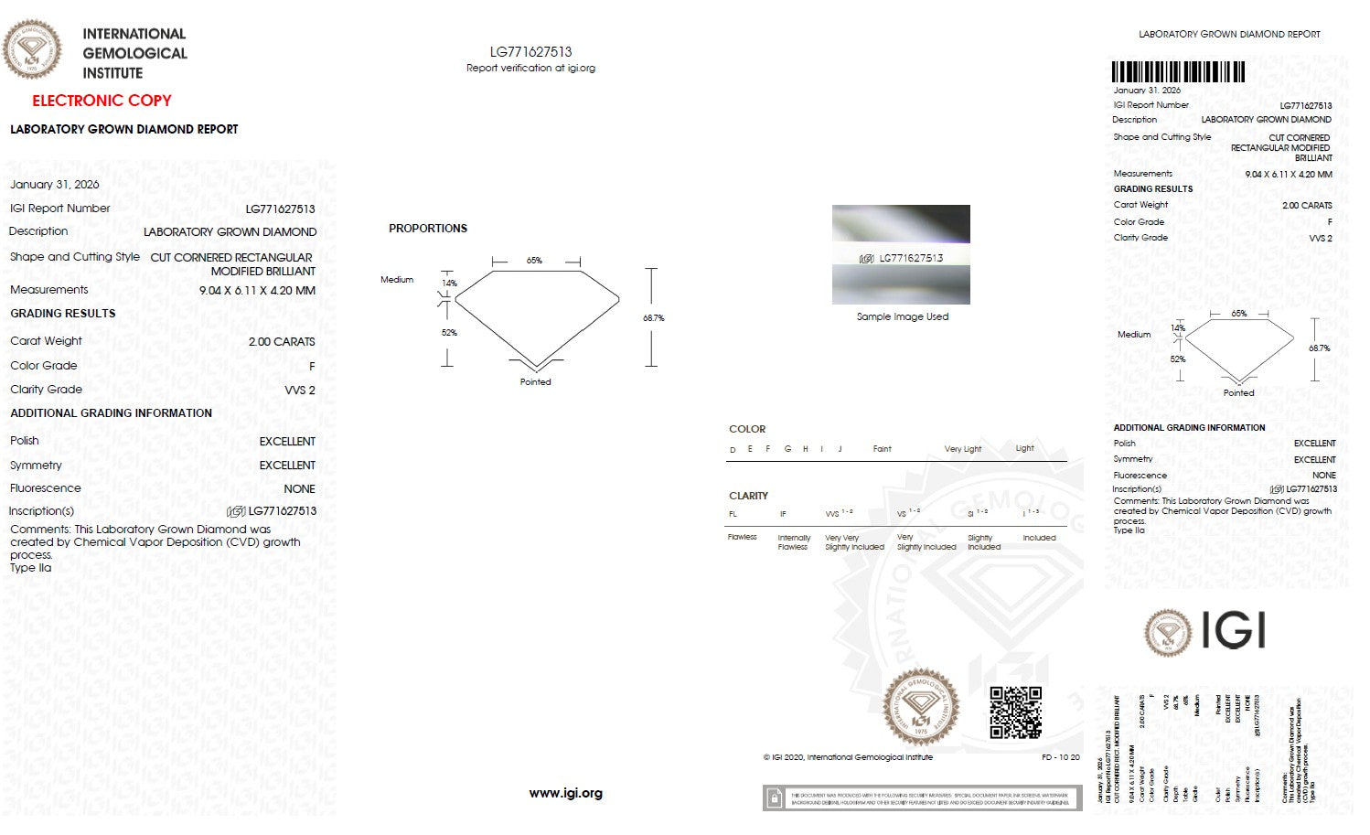 Exceptional 2.00 carat Radiant cut lab-grown diamond with outstanding brilliance and fire. This ethically sourced, IGI certified CVD diamond combines modern technology with timeless elegance.