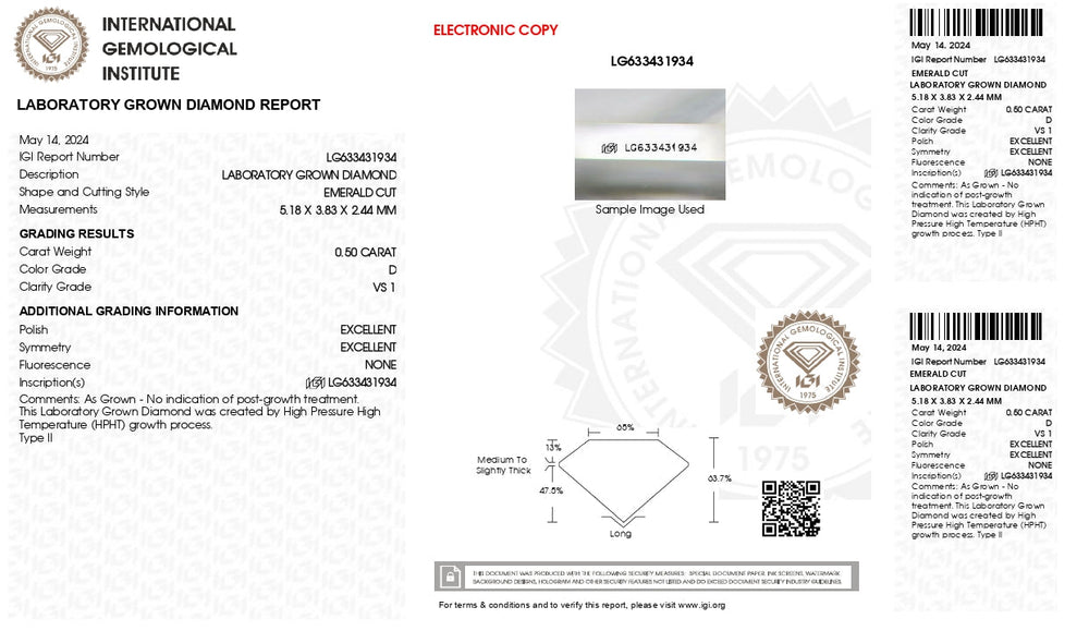 Objevte nadčasovou eleganci a výjimečnou kvalitu našeho IGI certifikovaného 0,50 CT Emerald Cut Lab-pěstovaný diamant. Tento diamant ztělesňuje sofistikovanost a brilanci, dokonale vytvořený a eticky povýšený.