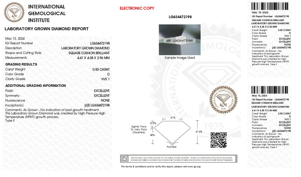 Zvyšte sbírku šperků pomocí této vynikající IGI certifikované 0,50 karátového polštáře Cut Cut Lab Grown Diamond. Tento diamant je vytvořen metodou HPHT (vysokotlaké teploty s vysokou teplotou) a může se pochlubit výjimečnými charakteristikami, což z něj činí podmanivou volbu pro vaše nejcennější šperky.