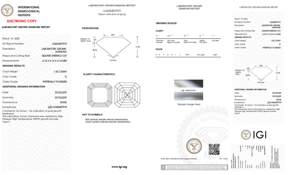 IGI Certified 1,52 CT Lab -pěstované čtvercové smaragdové diamantové - D barva, vnitřně bezchybná