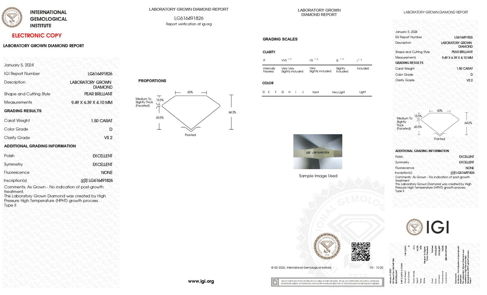 Radiant 1,50 CT Pear Cut Lab Grown Diamond - IGI Certified, D Color, vs2 Clarity