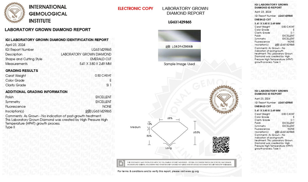 Elevate your jewelry collection with the timeless elegance of our IGI Certified 0.50 CT Emerald Cut Lab-Grown Diamond. Meticulously crafted and ethically sourced, this diamond boasts a captivating E color and impressive SI1 clarity.