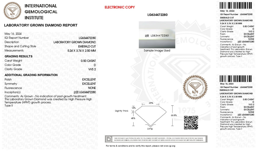 Brilliant 0.50 CT Emerald Cut Lab-Grown Diamond - IGI Certified, VVS2 Clarity, D Color