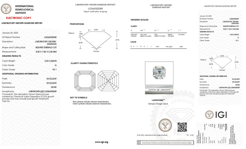 Exquisite 3.00 CT Square Emerald Cut Lab Grown Diamond - IGI Certified, VS1 Clarity, G Color