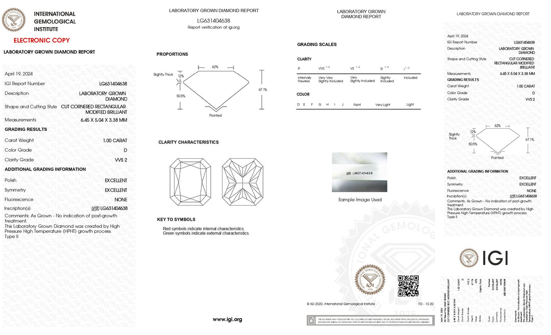 Experience the timeless elegance of this radiant-cut lab-grown diamond, certified by IGI, boasting exceptional features that enhance its brilliance: