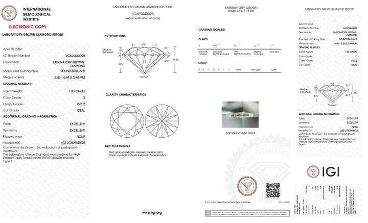 Elevate your jewelry collection with our exceptional IGI Certified 1.00 CT Round Lab Grown Diamond. This diamond is meticulously crafted using advanced High Pressure High Temperature (HPHT) technology, ensuring outstanding brilliance and purity. Here are its standout features: