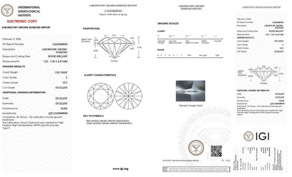 IGI -sertifioitu 1,50 ct pyöreä laboratorio kasvanut timantti - e väri, vs2 selkeys, erinomainen leikkaus