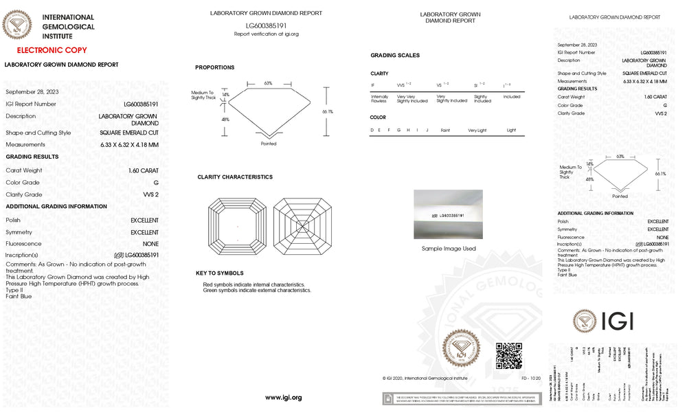 Explorez la sophistication de ce diamant cultivé en laboratoire coupé en laboratoire de 1,60 carat carré, méticuleusement conçu en utilisant la méthode HPHT avancée et certifiée par IGI. Ce diamant illustre une qualité exceptionnelle et un approvisionnement éthique, parfait pour ceux qui apprécient le luxe avec une conscience.