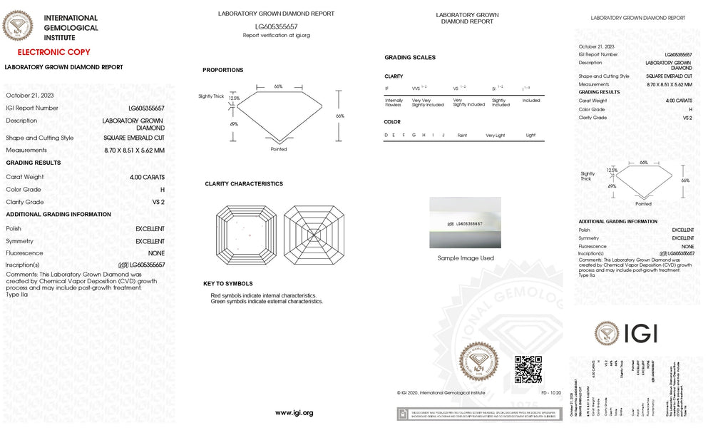IGI certifié 4,00 ct carré Emerald Cut Lab Grown Diamond - H Couleur, VS2 Clarity