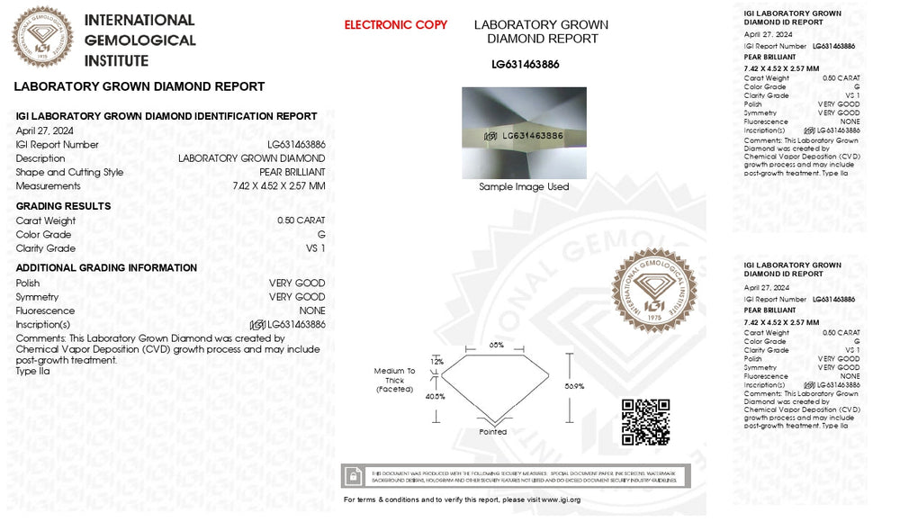 Temukan keanggunan didefinisikan ulang dengan IGI kami bersertifikat 0,50 ct pear cut lab-dewasa berlian. Dibuat menggunakan teknologi CVD mutakhir dan dengan cermat dinilai oleh IGI yang terkenal, batu permata yang indah ini memancarkan kecanggihan dan kecemerlangan.