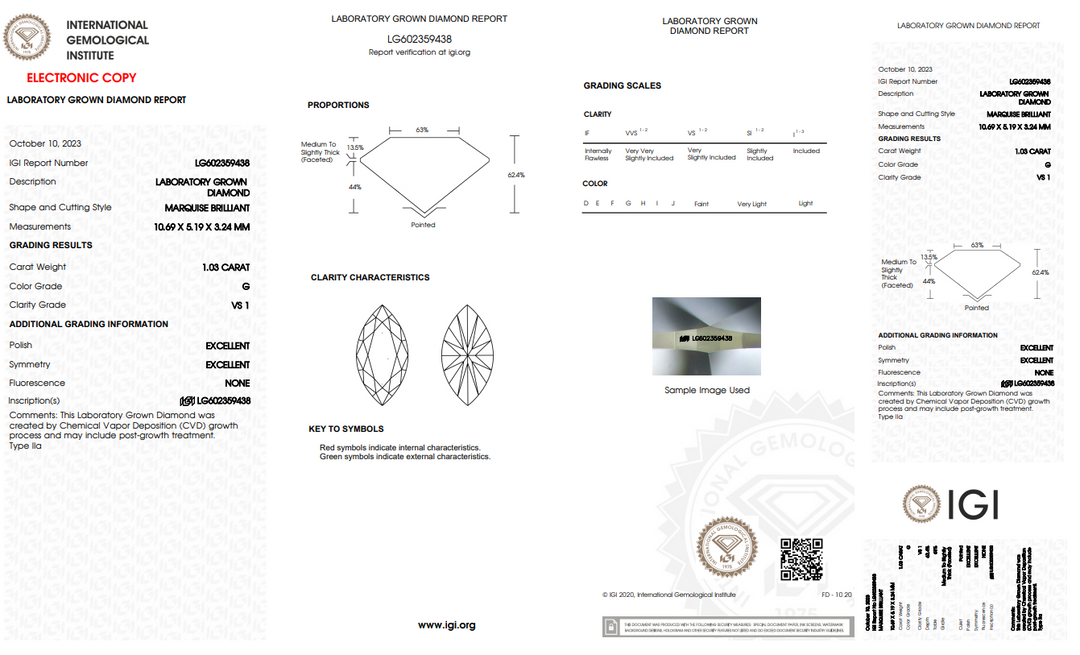 IGI Certified 1.03 CT Marquise Lab Grown Diamond, VS1 Clarity, G Color