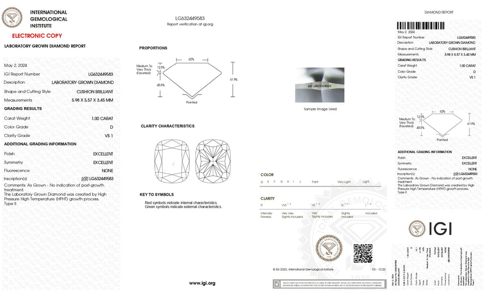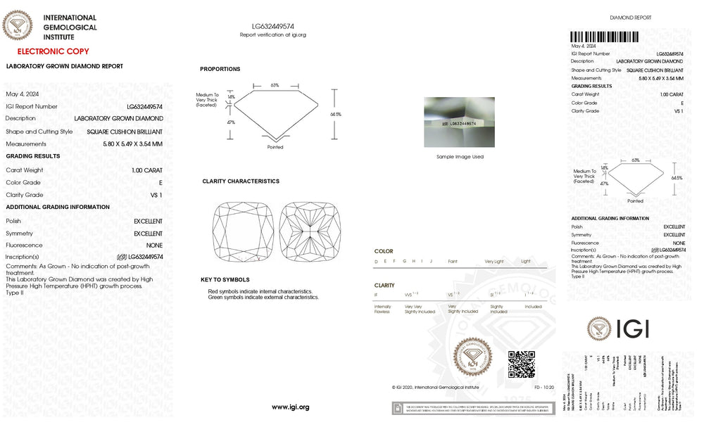 Hver diamant i samlingen vår har den prestisjetunge sertifiseringen fra International Gemological Institute (IGI), et vitnesbyrd om dets eksepsjonelle snitt, farge, klarhet og karatvekt. Med IGIs godkjenningsforsegling, kan du stole på at diamanten din er et ekte mesterverk, laget med presisjon og omsorg.