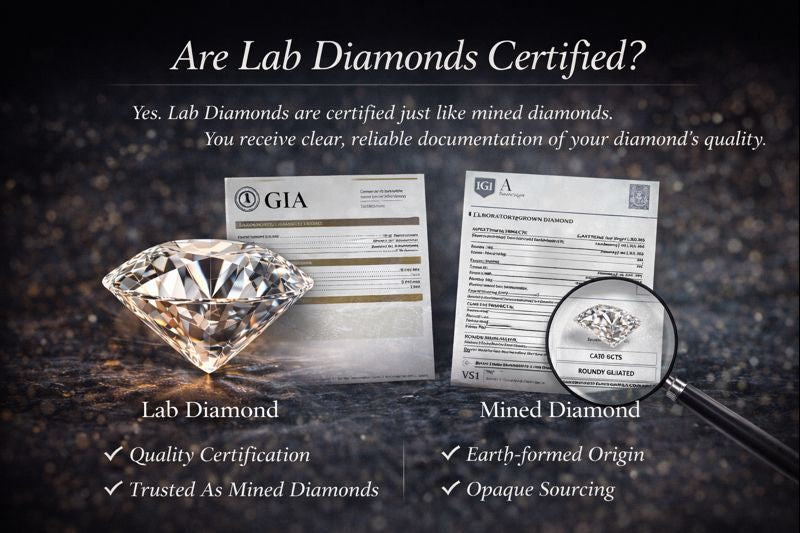 Yes. Lab diamonds are graded and certified using the same standards applied to mined diamonds. Certification provides clear information about the diamond’s cut, color, clarity, and carat weight—ensuring complete transparency.