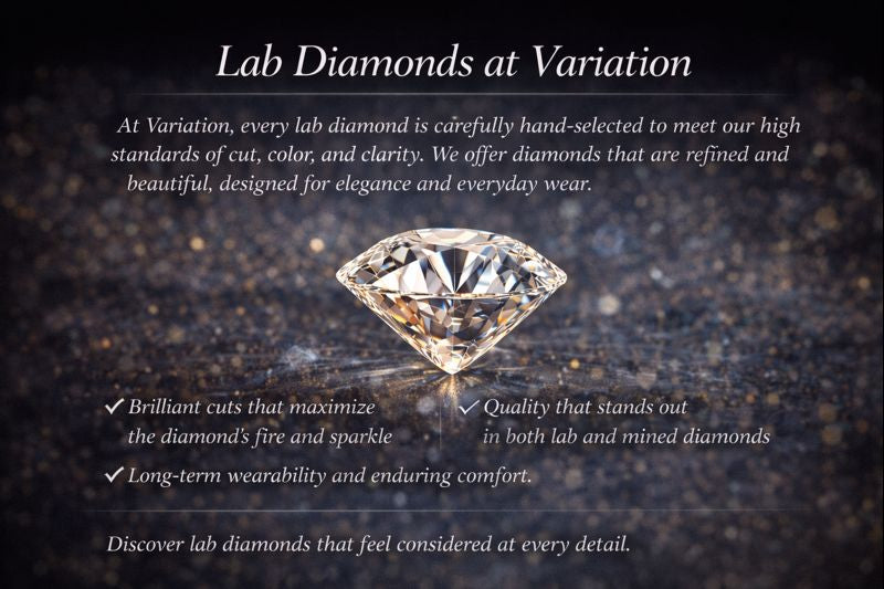 At Variation, every lab diamond is carefully selected to meet high standards of cut, color, and clarity. We focus on diamonds that perform beautifully in real life—balancing brilliance, comfort, and long-term wearability.