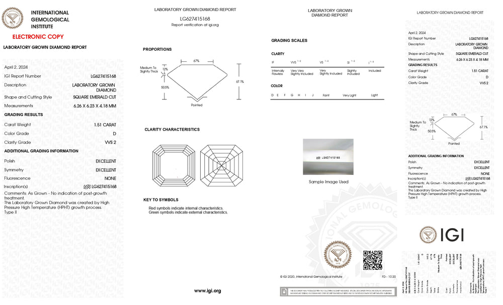 Сертифицированный IGI 1,51 CT Square Emerald Cut Lab Grown Diamond - VVS2 D Color
