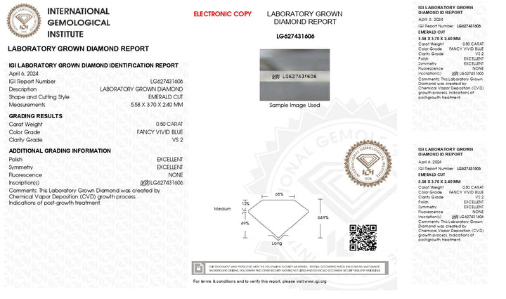 IGI sertifikalı 0.50 ct Emerald Cut laboratuvarda yetiştirilen elmasımızın eşsiz cazibesini deneyimleyin. Çarpıcı süslü canlı mavi rengi ile bu elmas, herhangi bir mücevher koleksiyonuna eşsiz ve zarif bir ektir.