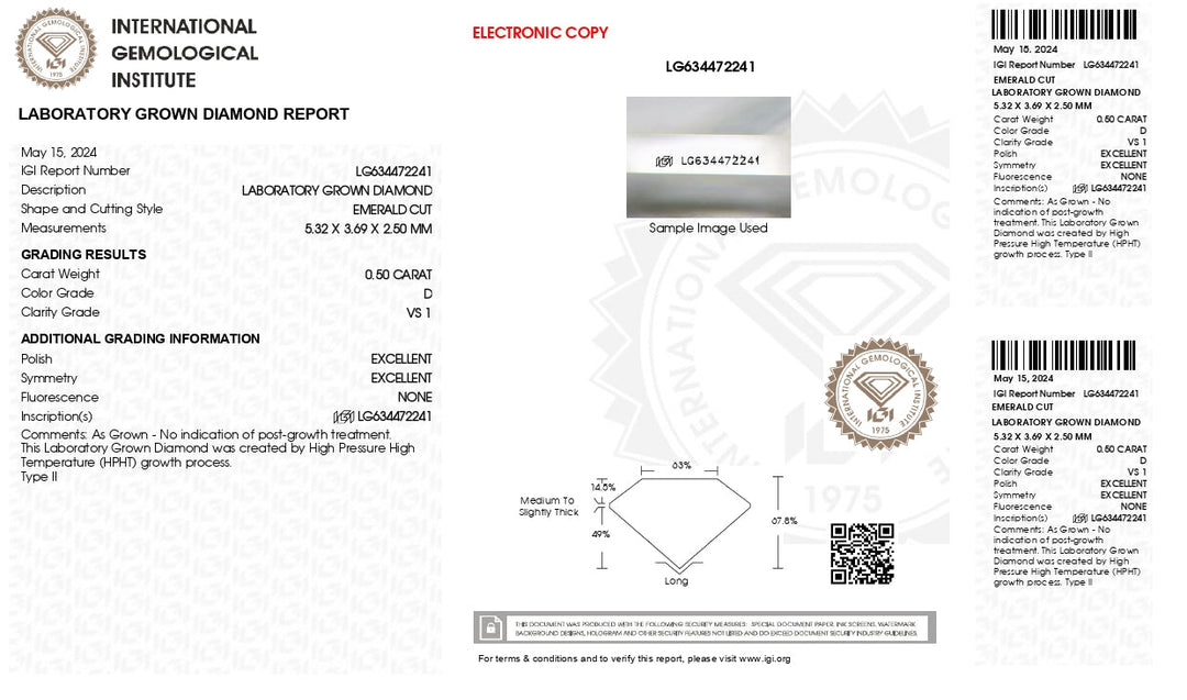 Takı koleksiyonunuzu IGI sertifikalı 0.50 ct Emerald Cut laboratuvarda yetiştirilen elmasımızın zamansız güzelliğiyle yükseltin. Mükemmelliğe hazırlanmış ve etik kaynaklı olan bu elmas sofistike ve parlaklık yayıyor.