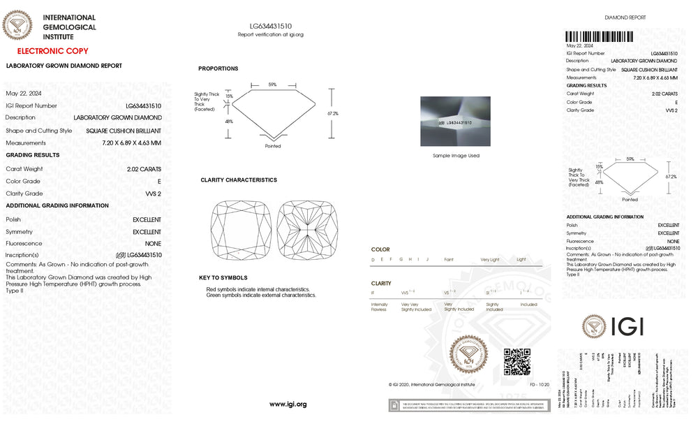 IGI Certified 2.02 CT E Color Cushion-Cut HPHT Lab-Grown Diamond