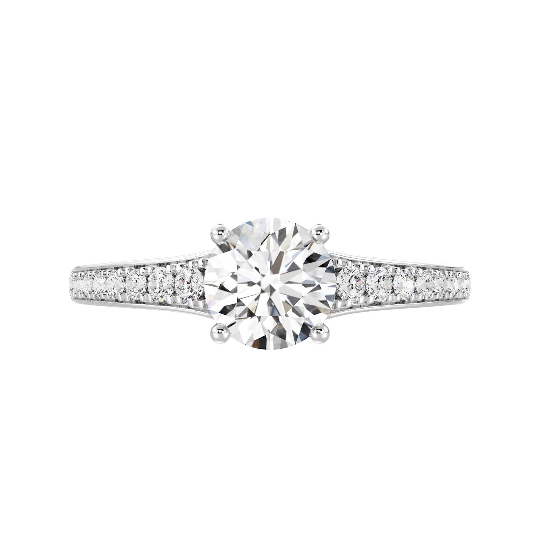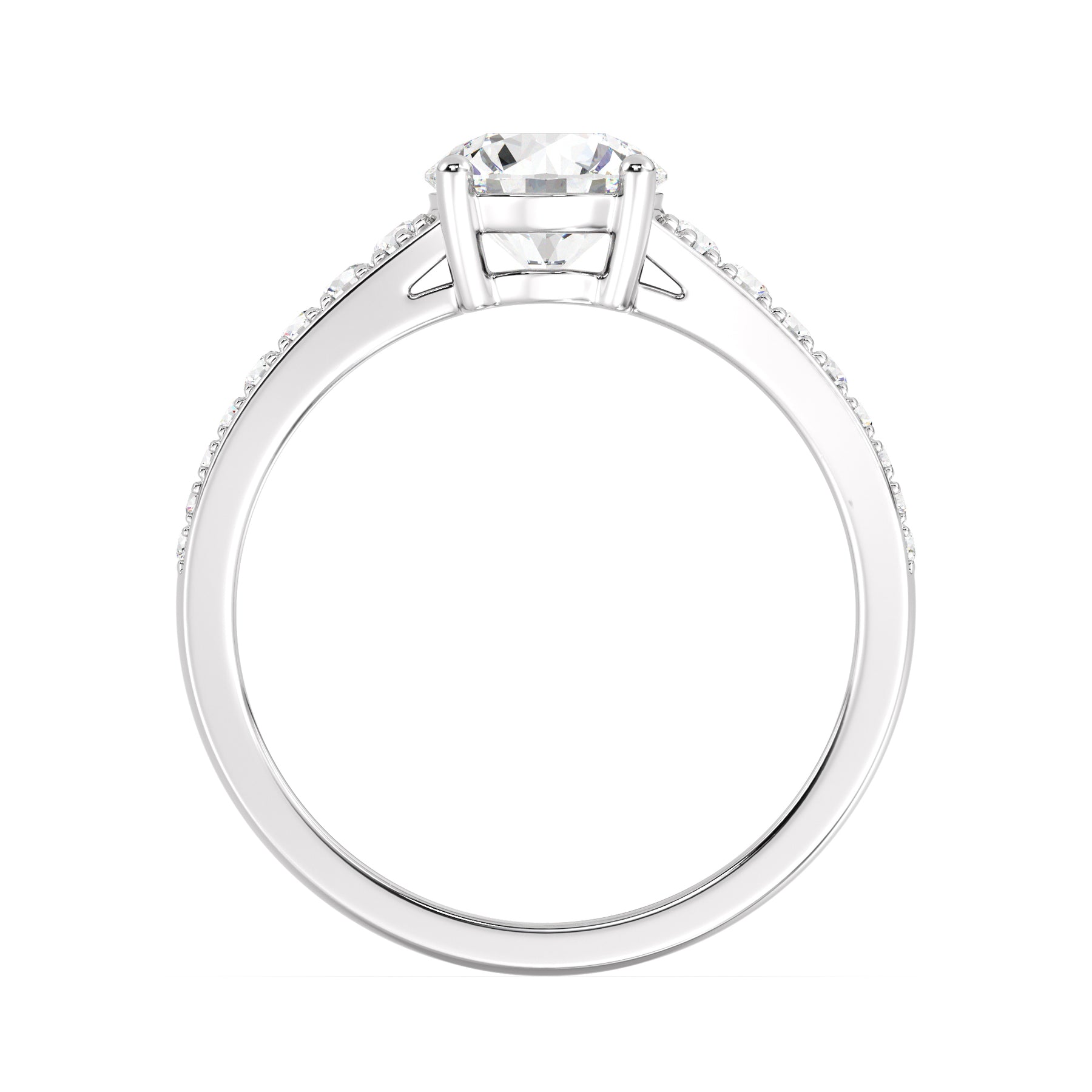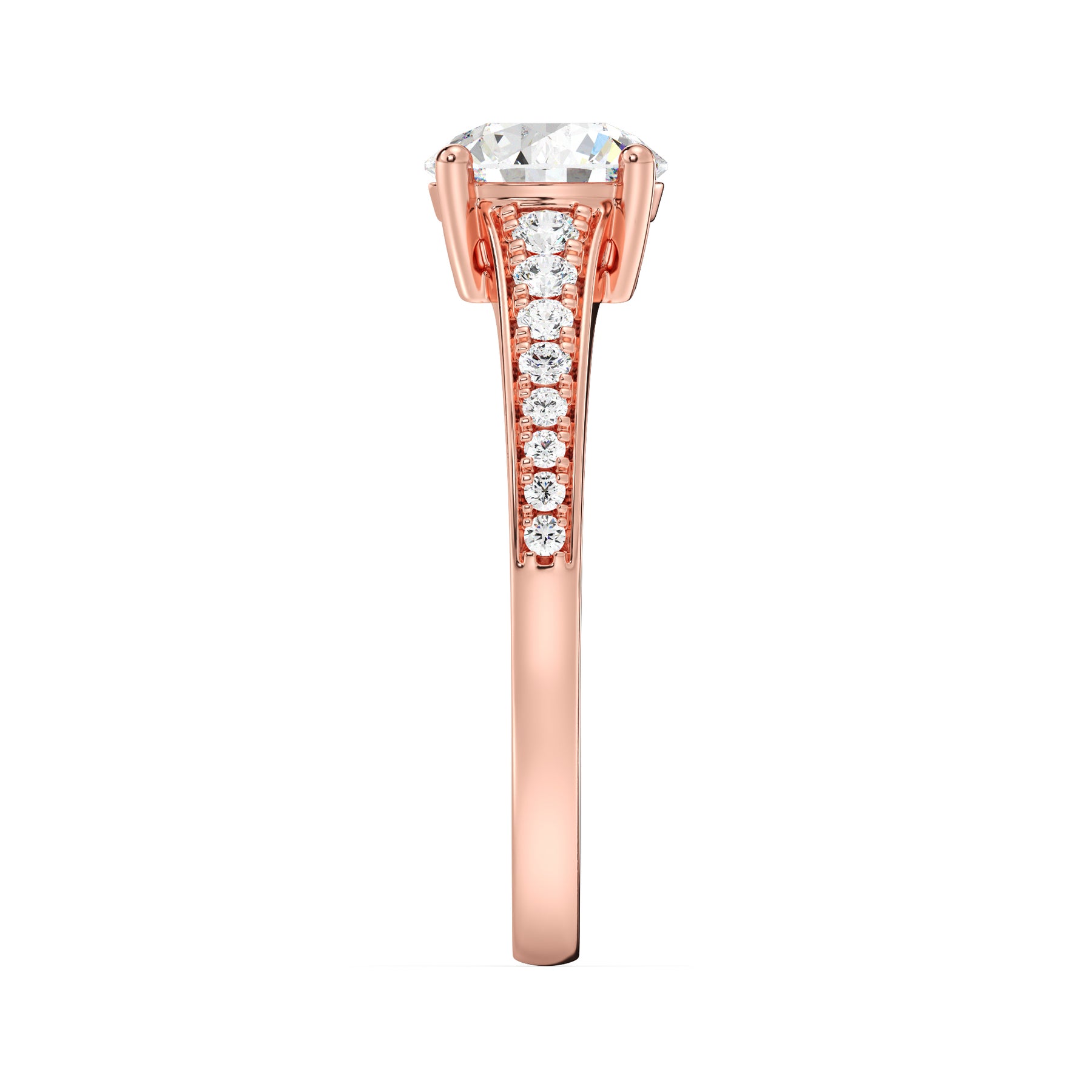 Make a statement with this 1.00ct Round-Cut Lab-Grown Diamond Ring, featuring a refined band that gracefully tapers from wide to narrow for an elegant, balanced silhouette. The IGI-certified center diamond radiates exceptional brilliance, perfectly complemented by 16 SGL-certified prong-set accent diamonds (0.21ct) that graduate in size along the shank — larger near the center and smaller toward the edge for a seamless flow of sparkle. Expertly crafted in 18K yellow, white, or rose gold, this ring embodies timeless beauty and contemporary craftsmanship, making it an exquisite choice for engagements or special occasions.