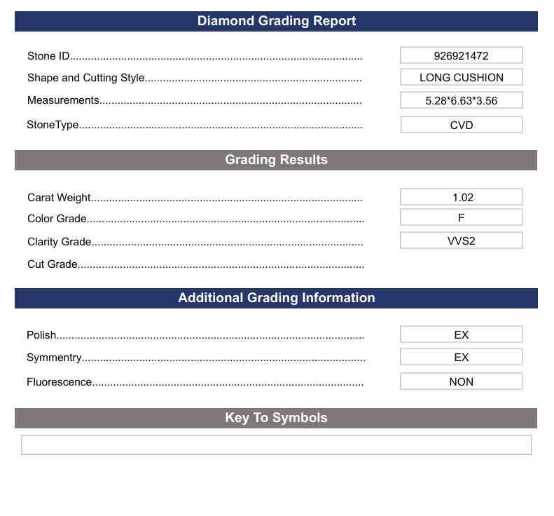 1,02 ct f Колір VVS2 Довга подушка з подушкою Лабораторія Діамант - Варіація сертифікована